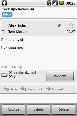Чтение писем реализовано вполне грамотно. Если к текстовому письму приложен графический файл, то он или сразу демонстрируется при просмотре, если имеет небольшие размеры, или выводится кнопка с предложением посмотреть (прослушать) приложение.