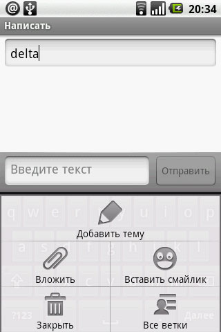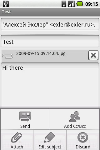 При создании нового письма нельзя вызвать список контактов (это не слишком удобно), однако при набирании адреса Android показывает подходящие варианты из контактов. К письму можно приложить изображение из галереи, а можно сделать кадр встроенной камерой и приложить только что сделанное фото.