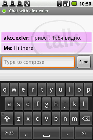 Google Talk интегрирован со службой GMail и здесь также поддерживается. Работает неплохо, я проверял. Если вернуться в десктоп, а в это время придет сообщение, оно на мгновение появится в верхней части экрана, а потом там останется значок, показывающий пришедшее новое сообщение.
