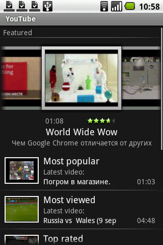 Поддерживается масштабирование мультитачем (двумя пальцами можно изменять масштаб отображения), работает JavaScript, и можно смотреть встроенные ролики Youtube - при воспроизведении они открываются в полном окне.