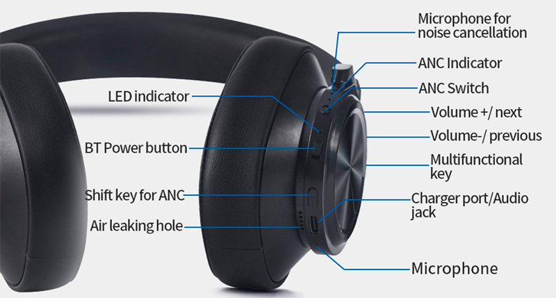 На правой чашке: микрофон для шумоподавления, включатель шумодава с индикатором, включатель питания с индикатором, переключатель трех режимов шумодава, порт USB-C.