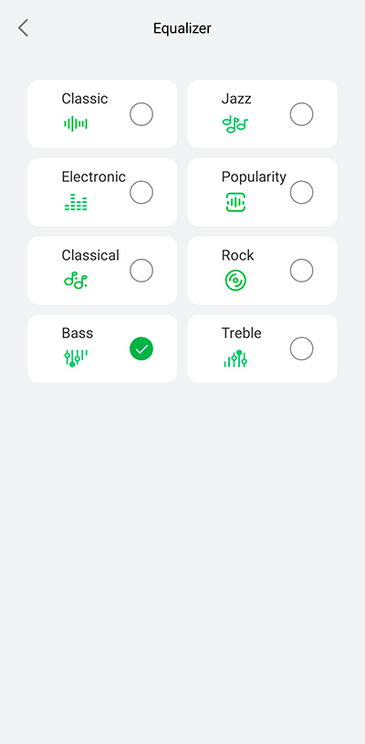 Остальные варианты мне не понравились: Bass - басы становятся гулкими и размазанными, средние и высокие теряют в детальности, Treble - высокие становятся очень резкими, Jazz - звук достаточно "плоский".