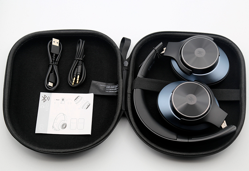 Комплектация: наушники, чехол, кабель для зарядки, метровый аудиокабель, руководство пользователя. Наушники складываются, в чехле могут фиксироваться специальной резинкой.