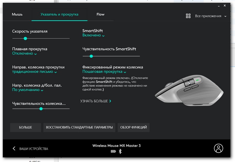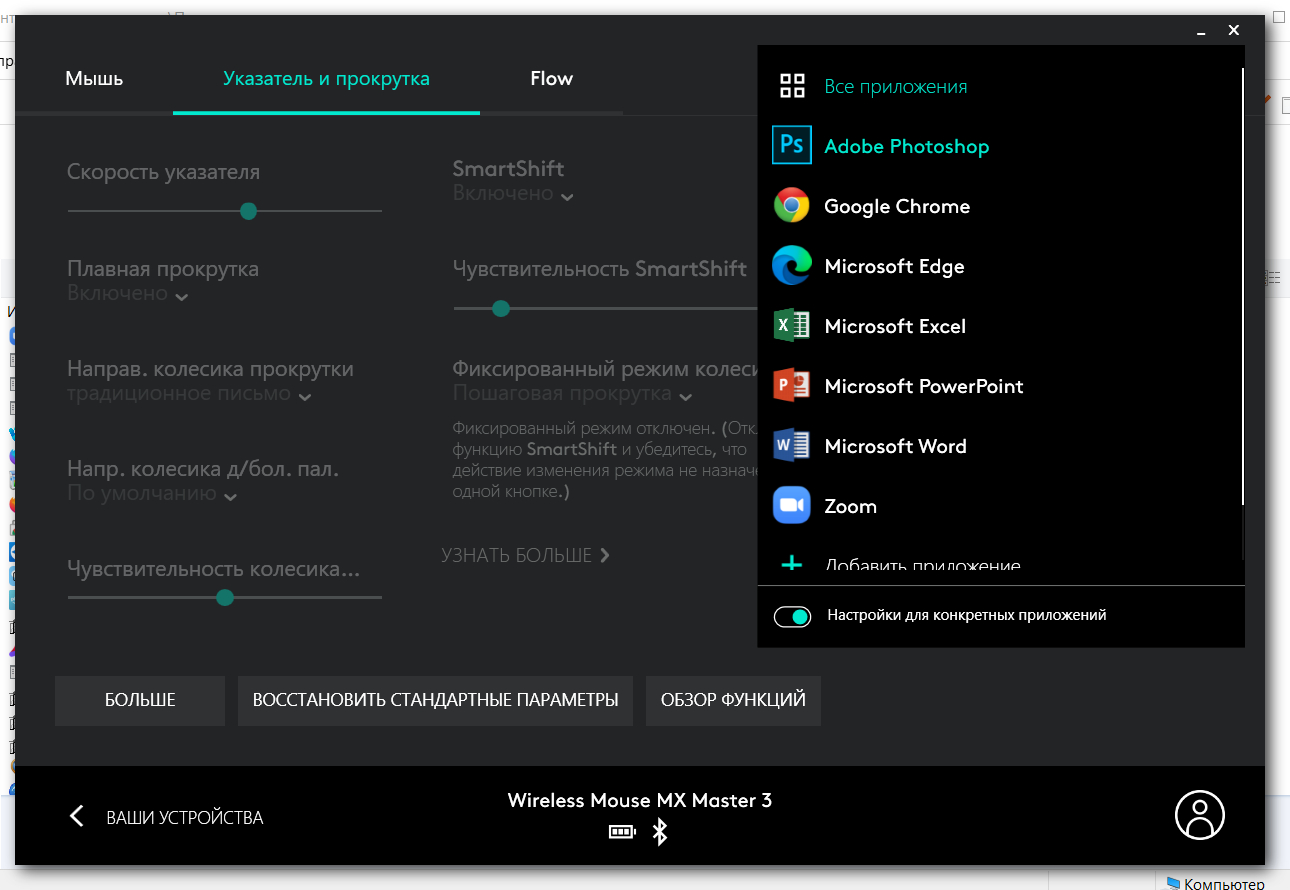 Мышь очень гибко настраивается, для этого служит программа Logitech Options, и там даже можно задавать отдельные настройки для конкретных приложений - Photoshop, Word и так далее.