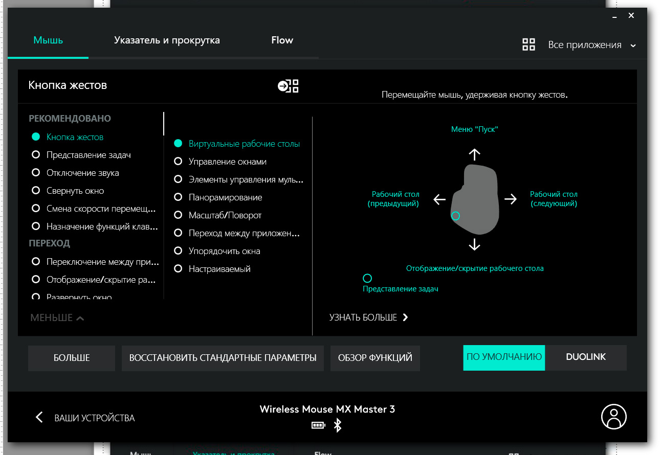 Кнопка жестов (по умолчанию кнопка под большим пальцем) имеет очень интересные функции: жесты мышью с нажатой этой кнопкой могут работать с виртуальными рабочими столами, с окнами, с масштабированием, также там и вовсе на жесты можно назначать все, что вам заблагорассудится.