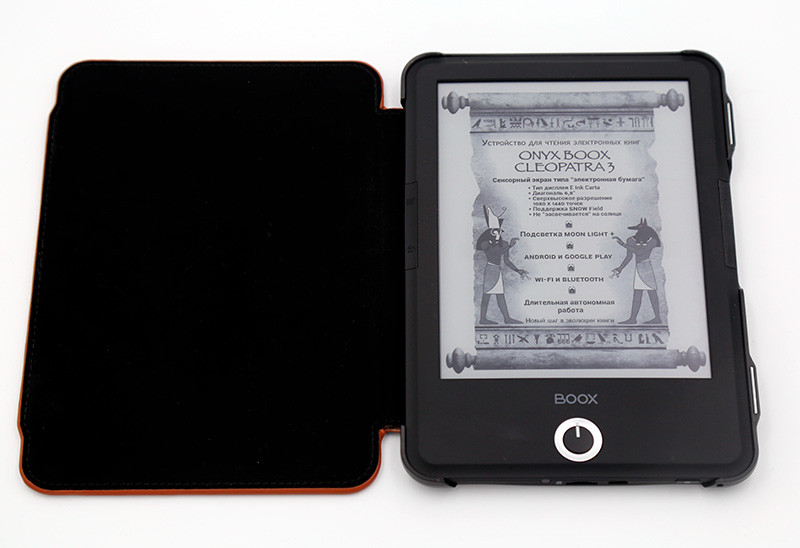 Входящий в комплект чехол и смотрится откровенно здорово (он сделан из экокожи с тиснением и прострочкой), и работает отлично: есть две магнитные защелки, также при закрытии чехол переводит ридер в режим сна.