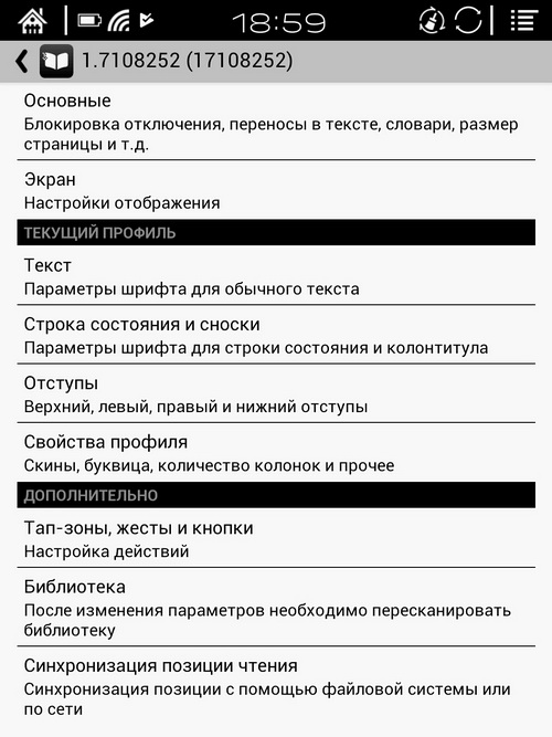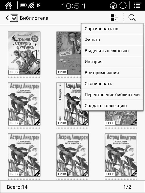 Я сначала удивился, когда увидел, что ридер вместо имени автора и названия книги, которые можно взять из метаданных, выводит имена файлов, но потом оказалось, что ему просто нужно дать команду просканировать библиотеку и извлечь метаданные - это делается с помощью меню, которое я показываю на следующем скриншоте. После этого все смотрится чинно и благородно.