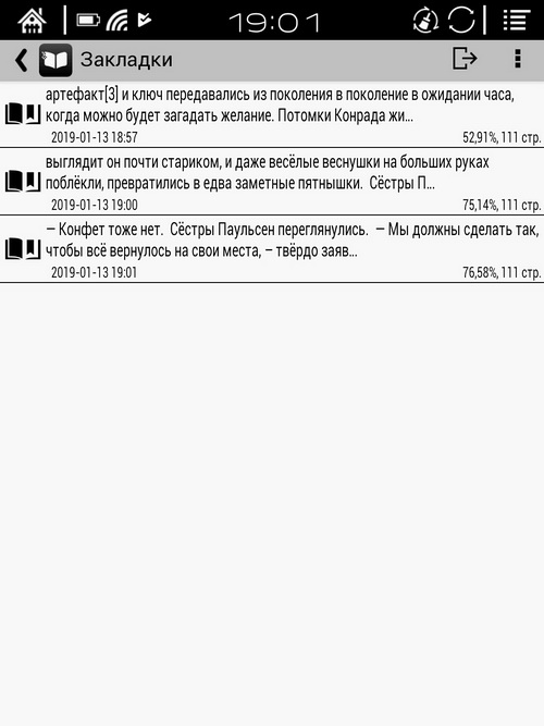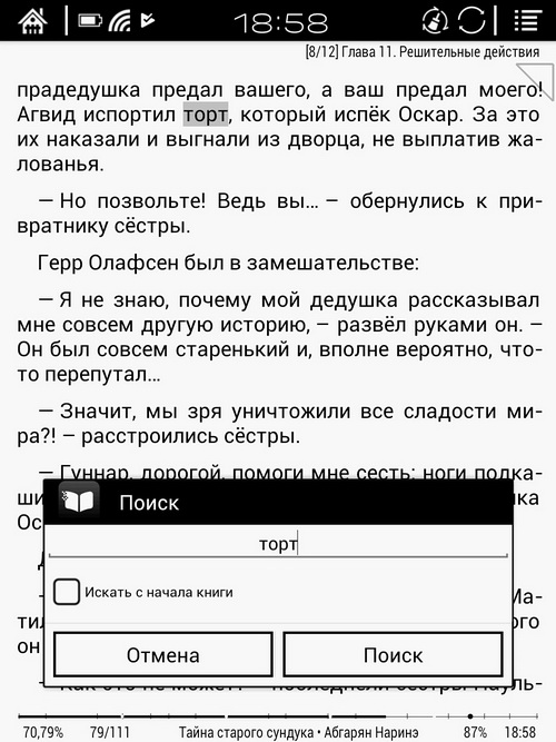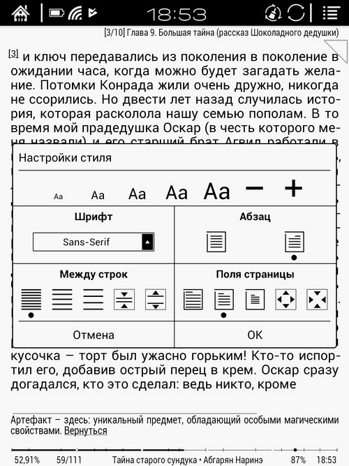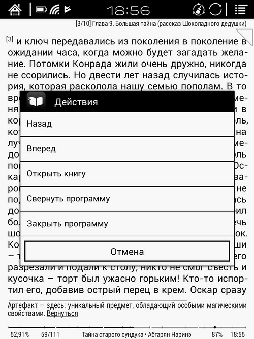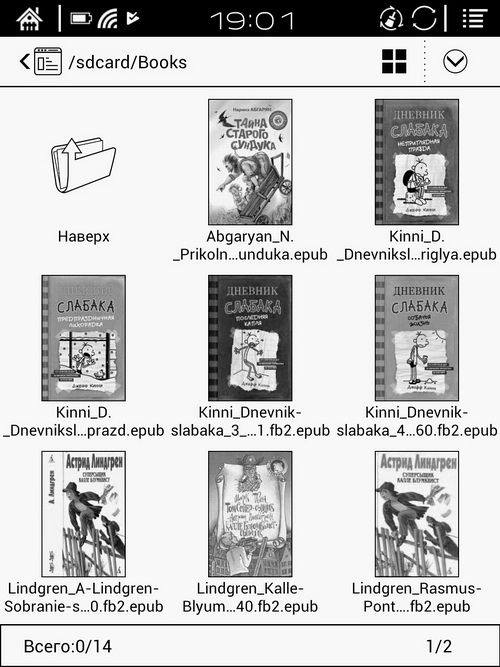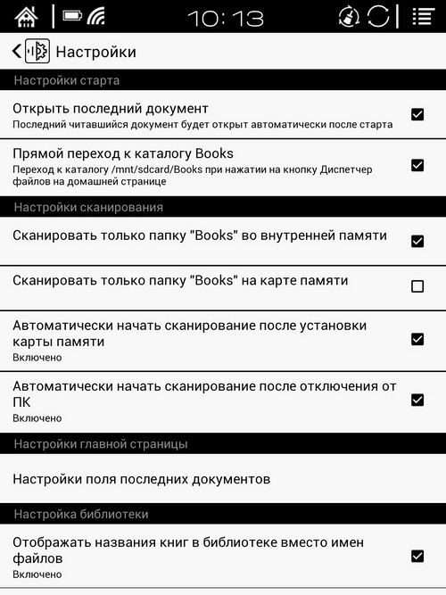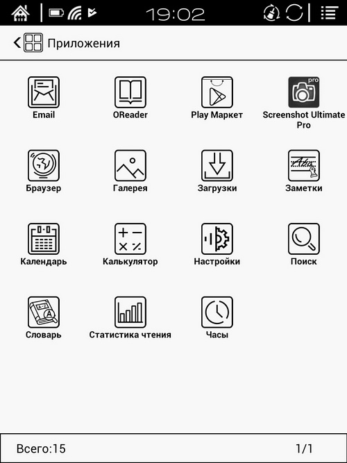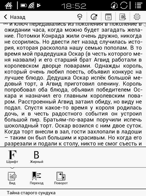 (Кстати, на форумах пишут, что скриншоты с этого ридера можно делать с помощью длинного нажатия стрелки вправо - так вот, это не работает. Экран-то там мигает, как будто делается скриншот, однако он никуда не сохраняется - ни во внутреннюю память, ни на microSD-карту. Но так как ридер на Android, я просто установил программу Screenshot Ultimate и сделал скриншоты с ее помощью.)