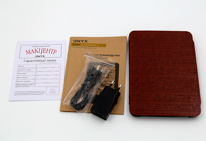 Комплект поставки: ридер, руководство пользователя, адаптер питания, кабель USB-microUSB, обложка-чехол, гарантийный талон.