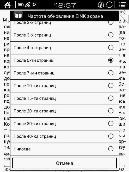 Пиктограмма с настройкой частоты обновления. Здесь используется технология SNOW Field - это такой режим работы экрана, который позволяет снизить количество артефактов при частичной перерисовке. Поэтому экран можно обновлять, например, после пяти страниц. Если вы замечаете артефакты от старых страниц - увеличьте частоту обновления.