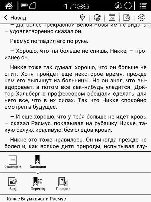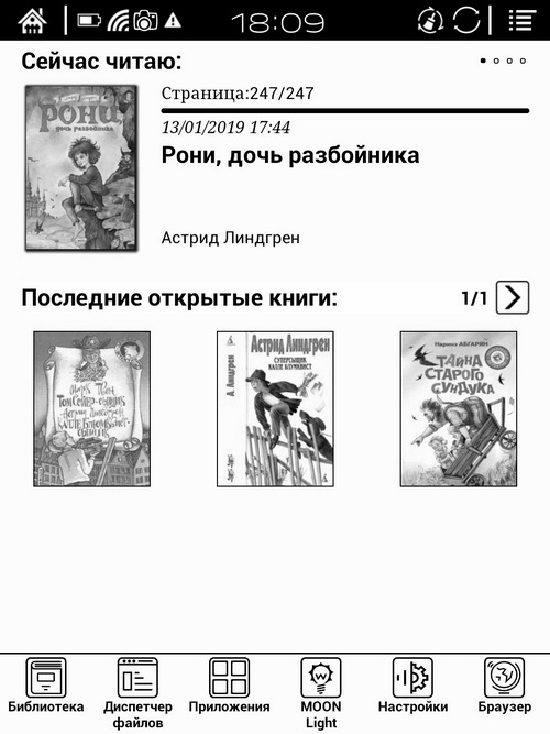Домашняя страница ридера. Сверху - статусная строка с различными данными и пиктограммами управления, далее идет книга, которая читается в настоящий момент, последние открытые книги и снизу - панель пиктограмм.