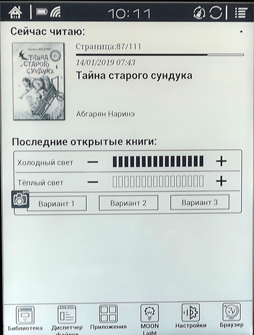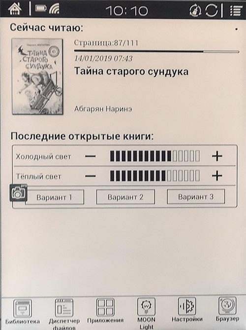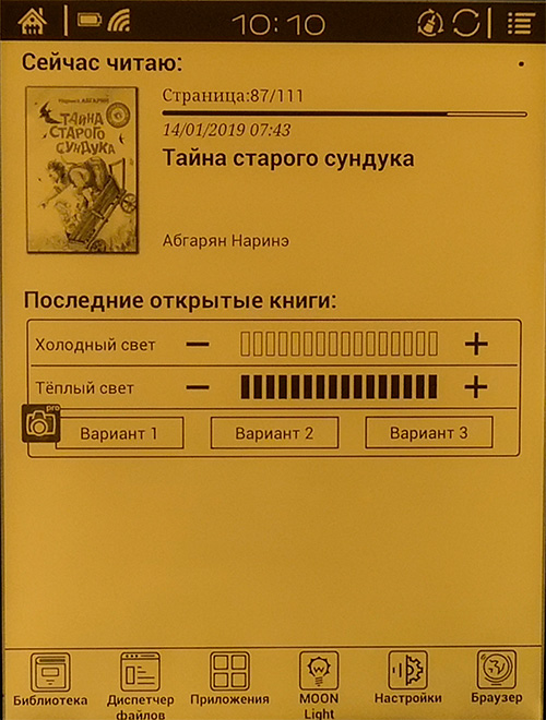 Пиктограмма включения и настройки подсветки MOON Light+. Подсветка регулируется и по яркости, и по цветовой температуре. Холодный оттенок подходит для чтения днем, теплый оттенок желателен при чтении перед сном.