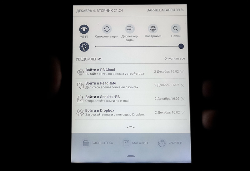 Здесь настраивается уровень свечения. Вот ридер в полной темноте с максимальным уровнем яркости. Для меня комфортная яркость в полной темноте была где-то на 50%, а при неярком освещении можно было выставлять и 100%. Настройки цветовой температуры, как во флагманских моделях PocketBook 632 и PocketBook 740, здесь нет. Но, если честно, я этим вообще не пользовался даже с ридерами, у которых такая настройка была.