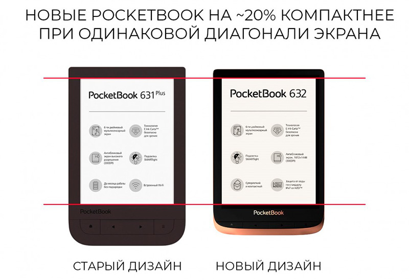 Ридер выглядит очень компактным, особенно в сравнении с предыдущими моделями. На сайте PocketBook есть изображение, наглядно показывающее разницу между старой линейкой и новой. И эта разница - очень существенная, не так ли? Размер дисплея не изменился, а ридер имеет почти такие же габариты, как пятидюймовые модели прошлых лет.