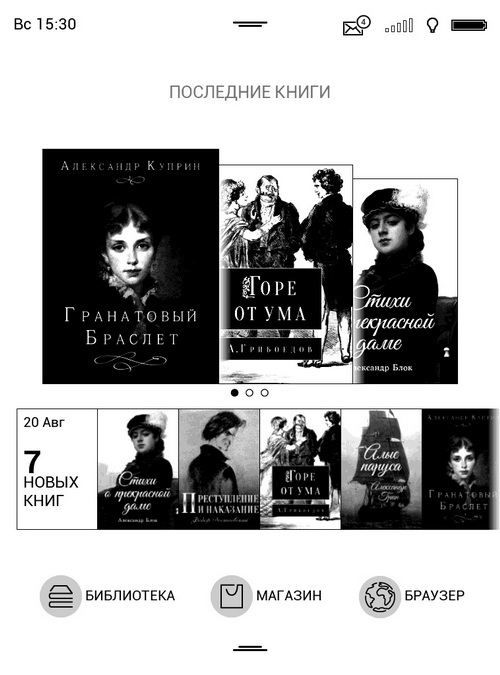 Браузер. Неторопливый, но пользоваться можно. Кстати, в нем теперь есть функция сохранения веб-страниц с последующим отображением в виде обычных книг в "Библиотеке" - это очень удобно: можно скачать при наличии Wi-Fi, а потом почитать в офлайне. Кроме того, в новой линейке ридеры стали немного быстрее - новая платформа и больше памяти.