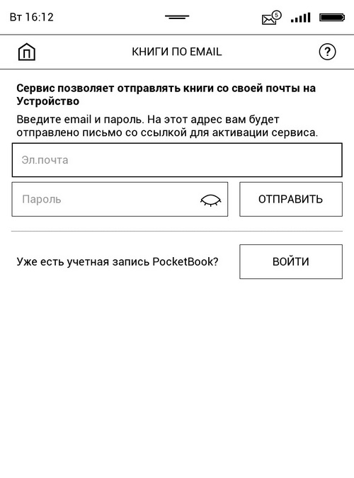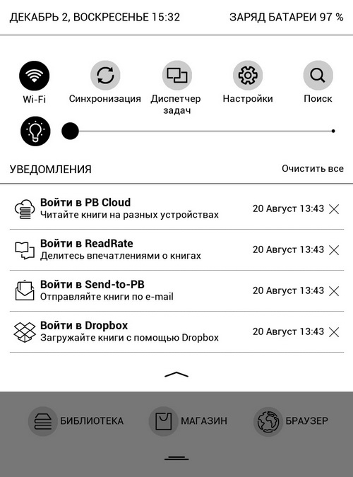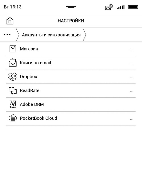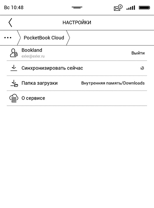 Одна из самых важных сервисных опций данного ридера - поддержка PocketBook Cloud. Этот сервис предназначен для синхронизации книг между ридером, смартфоном и планшетом, а также компьютером (через браузер). Причем синхронизируются не только книги, но и позиции чтения. Синхронизируемые книги могут быть как куплены в BookLand, так и загружены в устройство любым другим способом.