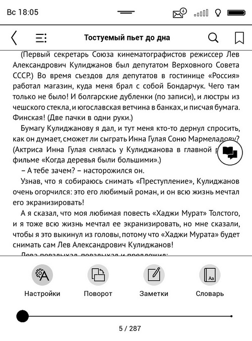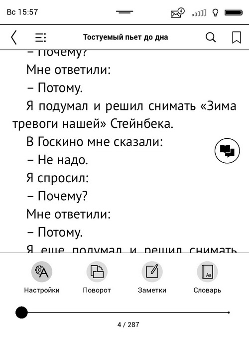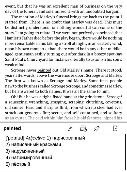 Встроенный англо-русский словарь позволяет в любой момент получать перевод выделенного слова прямо не выходя из текста - это удобно.И словарей здесь четыре (еще есть немецко-русский), также можно дополнительно устанавливать любые словари.