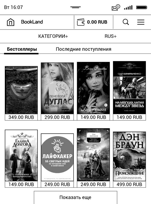 Возвращаемся на главную и переходим в раздел "Магазин" - подключение к сервису BookLand. Там представлено около трех миллионов единиц литературного контента на 18 языках. Кстати, это самый большой каталог электронных книг в России (больше "Литреса"). ВookLand можно отбирать книги по различным критериям, покупать их прямо с ридера и так далее.