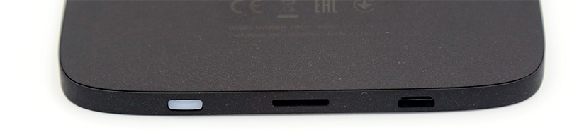 На нижнем торце - кнопка питания, слот для microSD, порт microUSB.