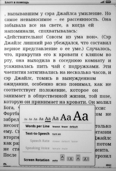 Возможности изменения гарнитуры шрифта тут нет - кушайте, что дают. Кегль, то есть размер символов, меняется в достаточно широких пределах - восемь вариантов. Причем в момент выбора настройки она сразу же отражается на экране.