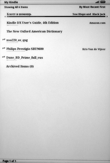 Стартовое окно у Kindle DX - традиционно для Kindle аскетичное. Просто список загруженных изданий.