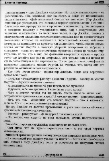 Так что мне не очень понятно, зачем вообще предусмотрен альбомный режим, раз в нем текст просто тупо растягивается на всю необъятную ширину экрана. Не говоря уж о том, что тут не предусмотрены клавиши листания в альбомном режиме, а использовать при этом обычные практически невозможно.