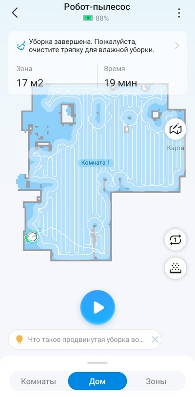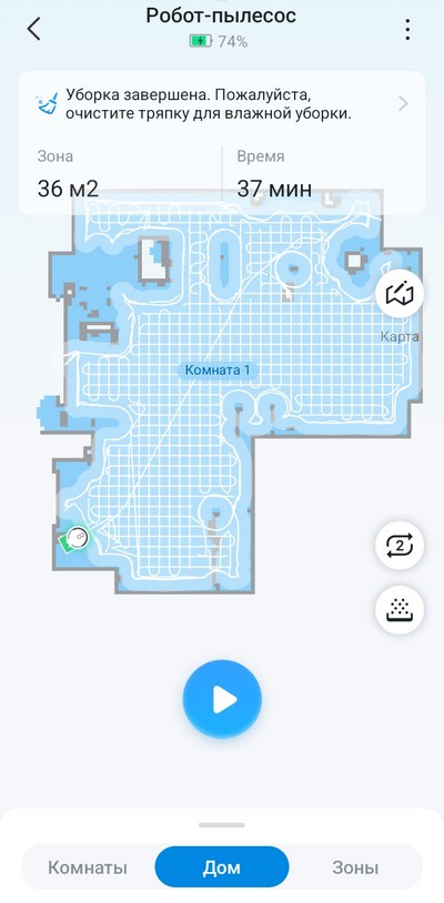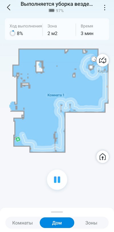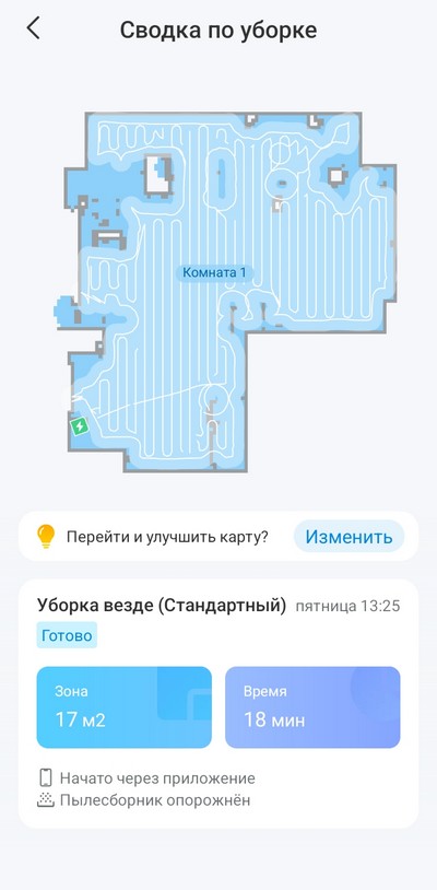 Ну и, в общем-то, все. Этот робот-пылесос можно запускать вручную, можно через приложение, можно по расписанию или по программам умного дома. Процесс уборки очень наглядный, за ним можно следить через приложение, вся история уборок, разумеется, хранится в приложении.