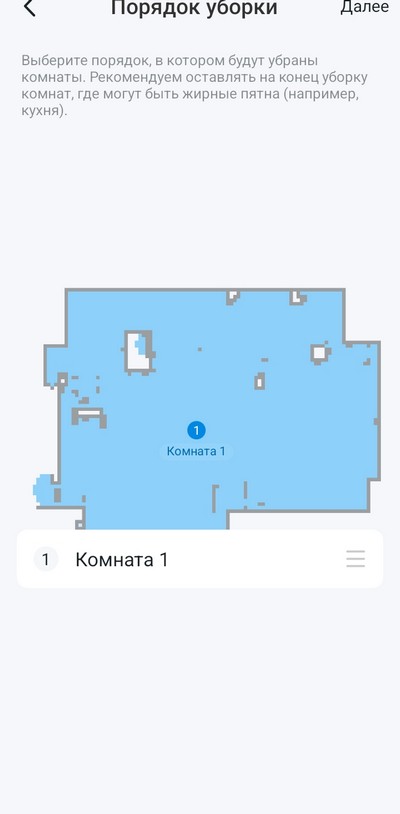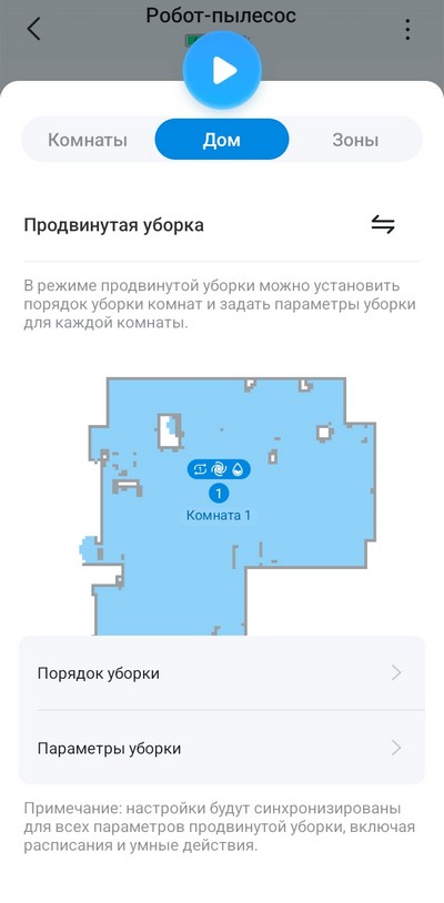 Режим продвинутой уборки с заданием параметров для каждой комнаты.