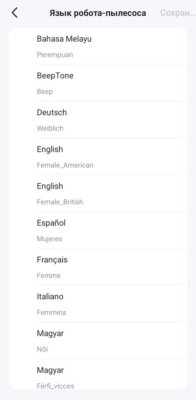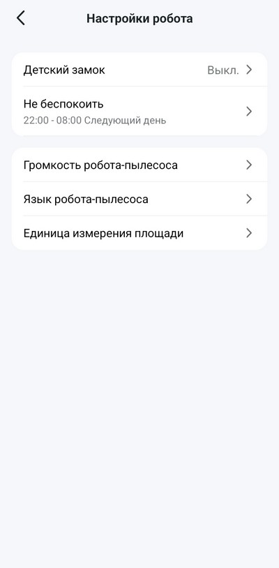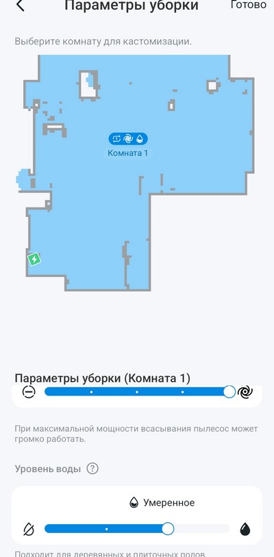 В приложении можно задавать порядок уборки помещений и параметры: количество уборок (например, два раза подряд - для большей чистоты), мощность уборки (чем больше мощность, тем больше шум), расход воды при влажной уборке.