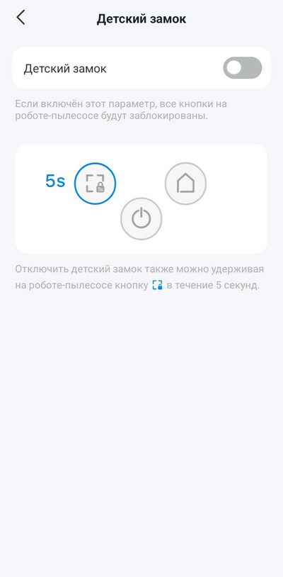 - Кнопка Spot/Child Lock (точечная уборка/детский замок): Однократное нажатие активирует локальную уборку в радиусе 1,5 м; удержание 5 секунд включает/выключает блокировку от детей и животных.