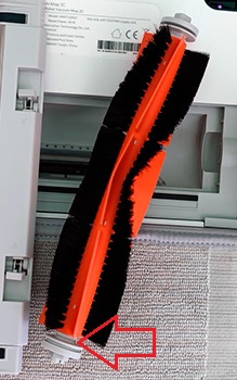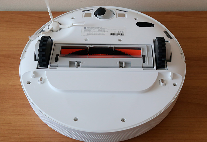 На нижней части расположены: колёсико направления, магнитные контакты для зарядки, боковая щетка, датчики падения, турбощётка, направляющие колёса, посадочное место для ёмкости с водой.
