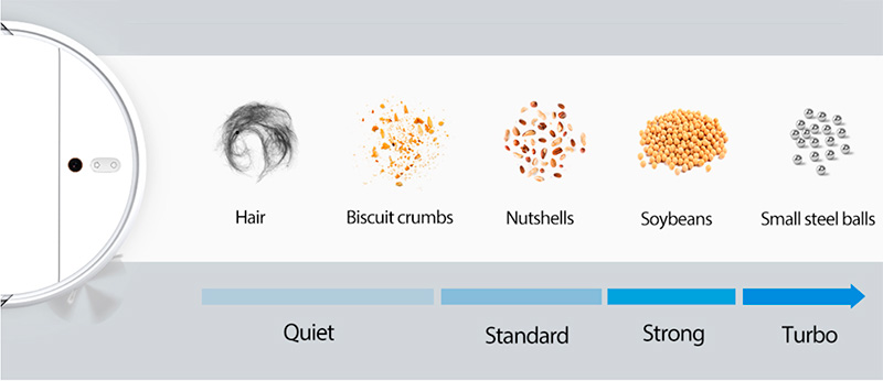 Производитель так определяет возможности всасывания на различных уровнях мощности. Тихий режим - пылесос может собирать шерсть, волосы и крошки. Обычный режим - скорлупу от орехов. В интенсивном режиме может засасывать бобовые, а в турборежиме - небольшие стальные шарики.