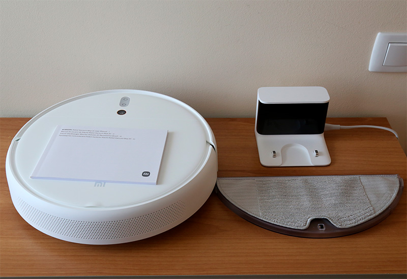 Комплект поставки: робот-пылесос, зарядная станция, зарядный кабель, инструкция на четырёх языках (английский, испанский, немецкий, русский), гарантийный талон, вращающаяся щетка, насадка для влажной уборки с тряпкой из микрофибры.