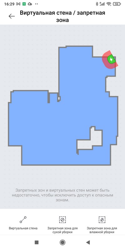 Можно также задать зону уборки, но после ее выполнения пылесос все равно поедет на станцию. Если не сможет доехать, то матюкнется на это и остановится.