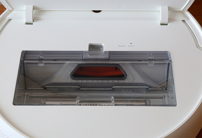 Верхняя крышка поднимается, под ней расположены кнопка Reset и светодиод, показывающий режим работы беспроводной сети: если светодиод мигает, то пылесос находится в режиме сопряжения, если горит голубым - устройство подключено к смартфону.
