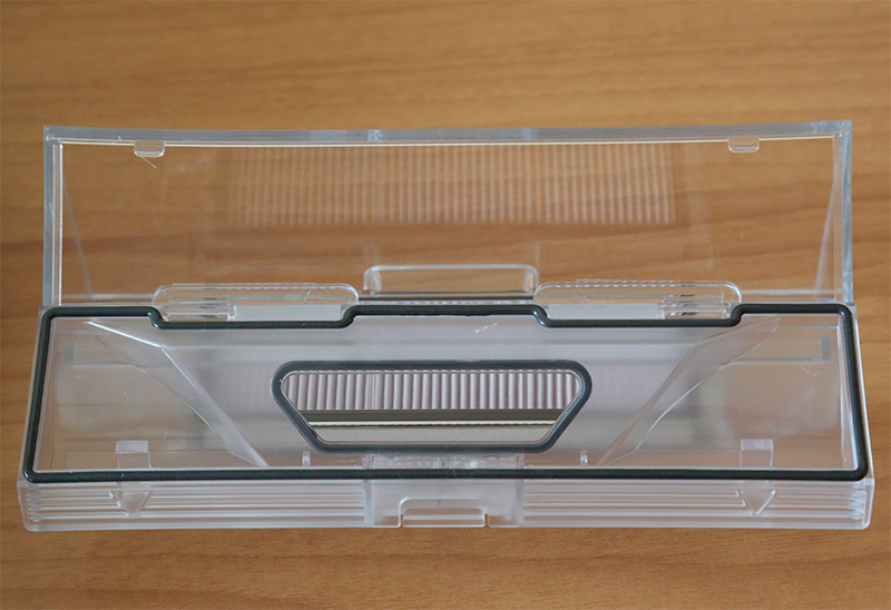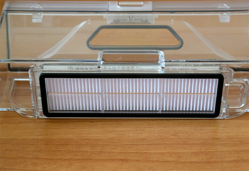 В контейнер вставлен HEPA-фильтр. На нём содержится предупреждение о том, что фильтр следует использовать сухим.