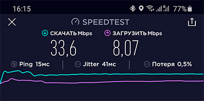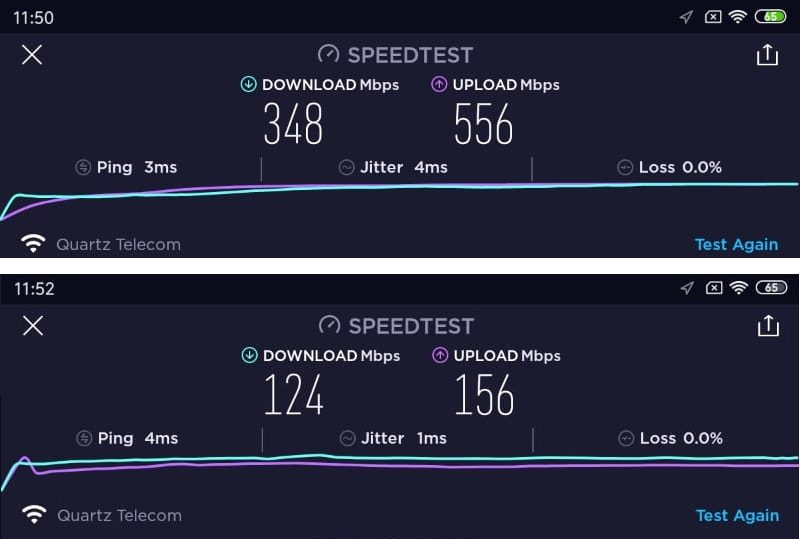 Вот у меня сверху в той же комнате, снизу - в другой, через коридор (WIFI 5). Tenda AC10 и Mi Pad 4 Plus. По проводу показывает 445.