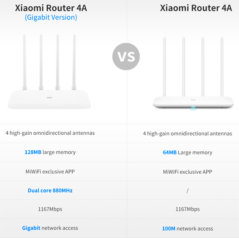 Из наиболее популярных у Xiaomi две модели: Xiaomi Wi-Fi Router 4A и Xiaomi Wi-Fi Router 4A Gigabit Edition. Их отличия показывает вот эта табличка.