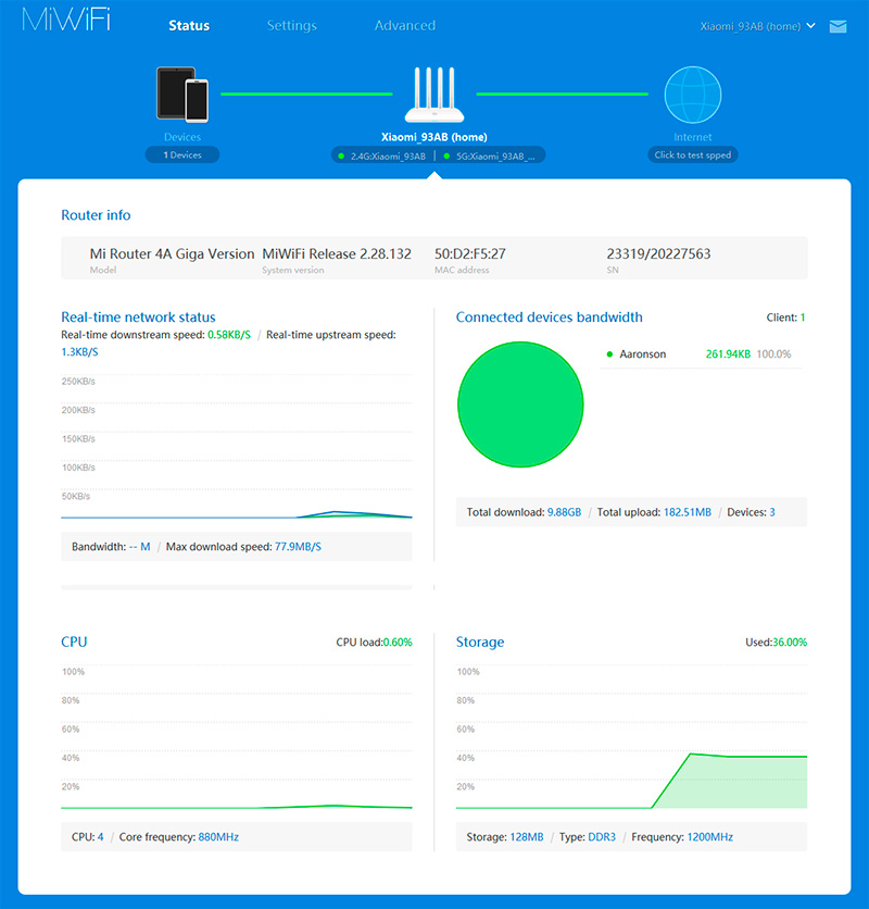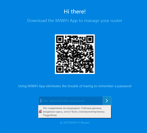 Теперь о настройках и функциях самого роутера. Адрес админки в браузере - тот же самый, miwifi.com. Пароль администратора при первичной установке - это пароль к сети Wi-Fi, но его, конечно же, потом нужно поменять.