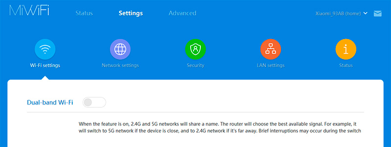 Раздел настроек. По умолчанию создаются две разные сети Wi-Fi - на 2,4 ГГц и на 5 ГГц, но можно настроить Wi-Fi как одну двухдиапазонную сеть, а на какой частоте подключаться - будут выбирать сами устройства (как известно, сеть 5 ГГц значительно быстрее, но работает на меньшем расстоянии, а 2,4 ГГц медленнее, но добивает дальше).