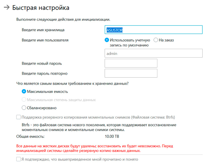 Нужно задать сетевое имя для NAS, задать логин и пароль для администратора, а также выбрать свои предпочтения для организации дисков: максимальная емкость, сбалансированные требования.