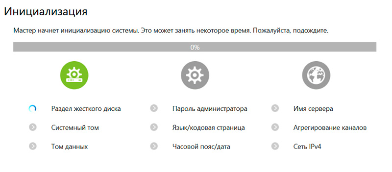 При первом заходе в админку запускается программа первичной инициализации. Она рассчитана как на совершенно непродвинутых пользователей, для которых все делается практически автоматом, так и на тех пользователей, которые хорошо себе представляют, что им от этого NAS нужно получить.