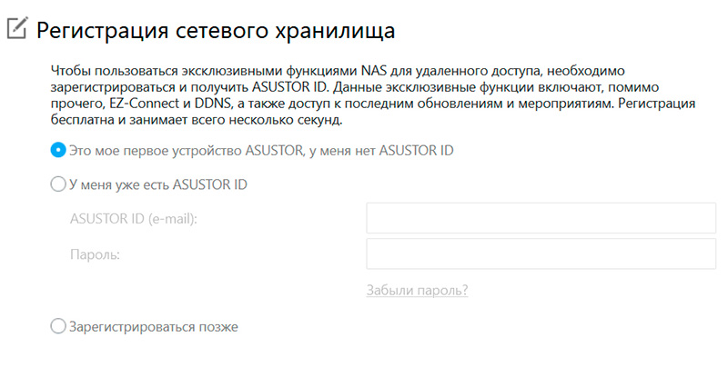 Если вам нужен будет удаленный доступ, то тут следует завести ASUSTOR ID или подключиться к уже имеющемуся.