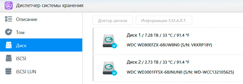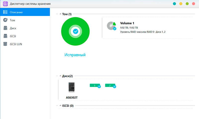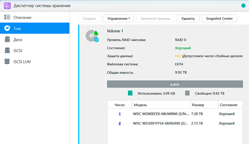 Диспетчер системы хранения. Я заказал максимальную емкость, в результате из двух дисков на 8 и на 3 ТБ накопитель сделал общий том RAID 0 на 10 ТБ.