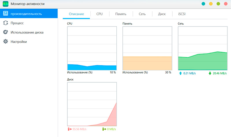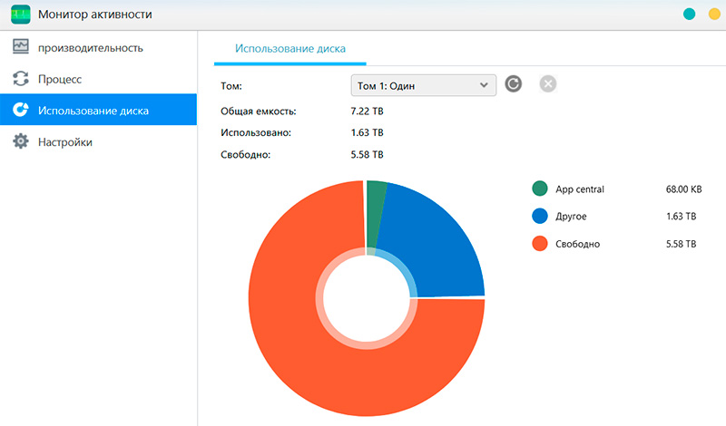 Приложение "Монитор активности". Показывает использование всех ресурсов накопителя, загрузку процессора, наглядную круговую диаграмму использования диска.