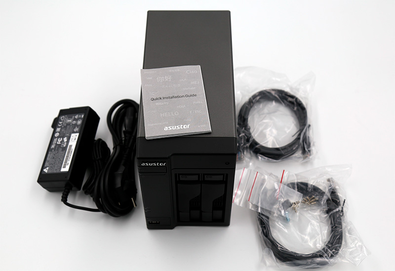 В комплекте - накопитель, питание, два сетевых кабеля, RJ-45, набор крепежа для дисков (по восемь винтов для жестких дисков 3,5" и дисков 2,5"), руководство по быстрой установке. (Есть варианты комплектации, где присутствует пульт управления NAS как медиаплеером, но этот пульт всегда можно купить отдельно.)