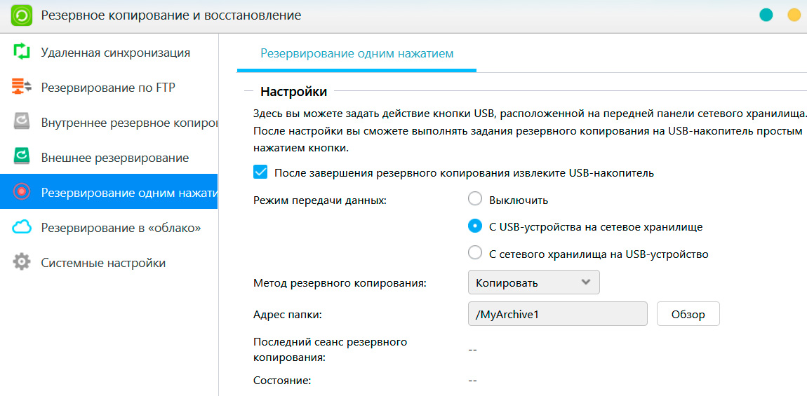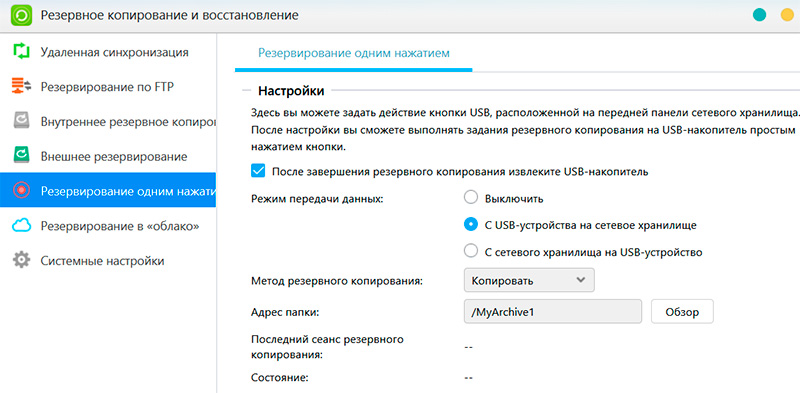 На передней панели накопителя есть кнопка, рядом с которой расположен порт USB 3.0. Если вставить в этот порт флешку/диск, то нажатием кнопки можно все содержимое скопировать во встроенный накопитель NAS (или наоборот, как задать). И в данном разделе как раз и определяется, что будет делаться при нажатии на данную кнопку.