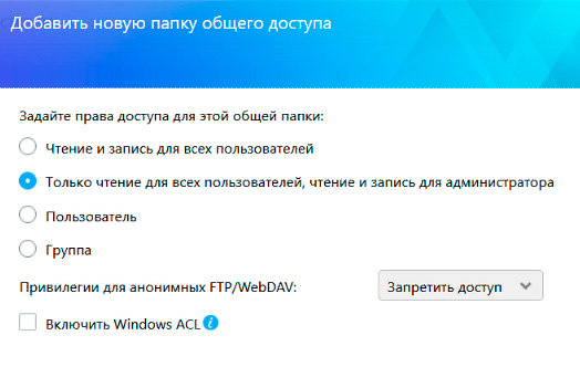 Папки и пользователи здесь задаются в разделе "Управление доступом". (Сильно уменьшенные скриншоты - кликабельны.)