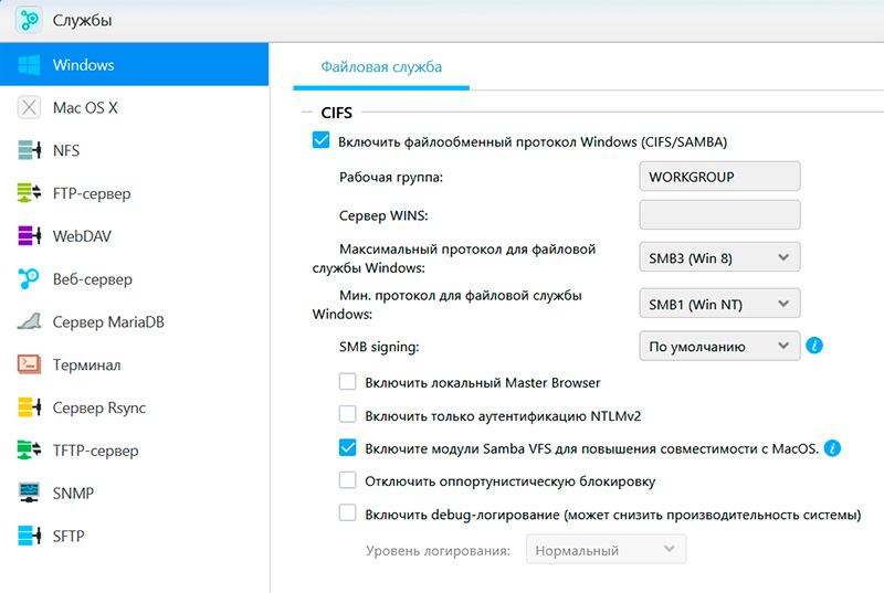 Сетевые протоколы: CIFS / SMB, SMB 2.0 / 3.0, AFP, NFS, FTP (поддержка Юникода), TFTP, WebDAV, Rsync, SSH, SFTP, iSCSI/IP-SAN, HTTP, HTTPS, Proxy, SNMP, Syslog