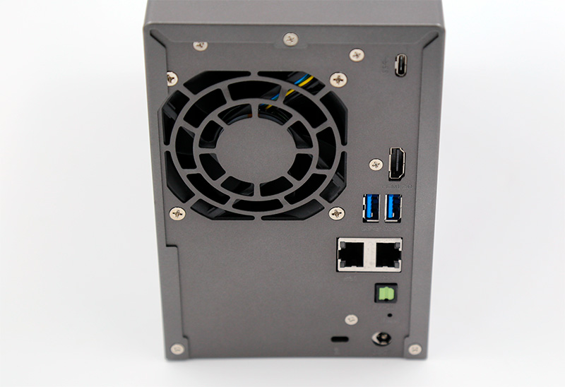 На задней крышке - вентилятор с автоматической регулировкой, порт Type-C, порт HDMI, два порта USB 3.0, два гигабитных сетевых порта, оптический аудиовыход S/PDIF, вход адаптера питания, кенсингтонский замок.